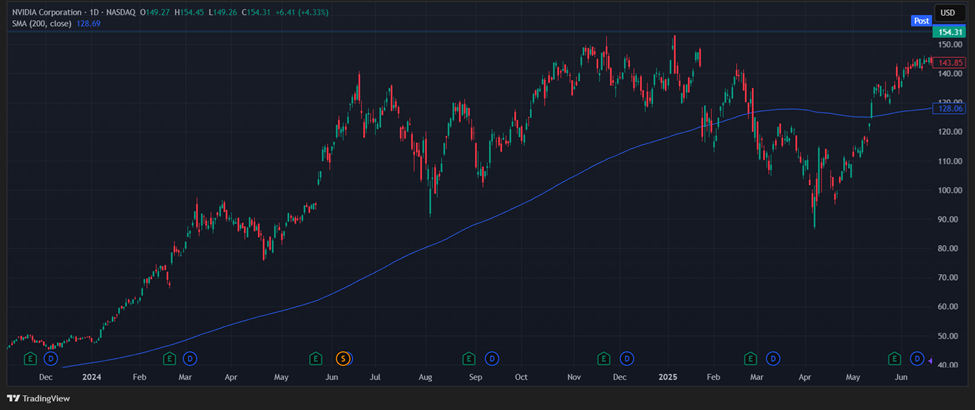 Actualmente, el precio de NVDA se encuentra por encima de su media móvil de 200 días (SMA 200), que está en US$128.06, mientras el precio actual es de US$143.61. Esta ruptura al alza por encima de la media de largo plazo es un signo de fuerza técnica y continuidad en la tendencia alcista. Para los inversores de largo plazo, esta señal puede interpretarse como una validación del momentum actual.