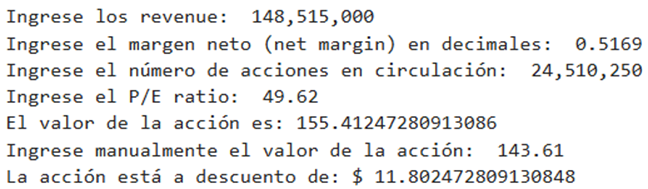 Resultado del modelo en Python llamado “Evaluador de Precio Teórico de Acciones”, basado en revenue, margen neto, acciones en circulación y P/E ratio.